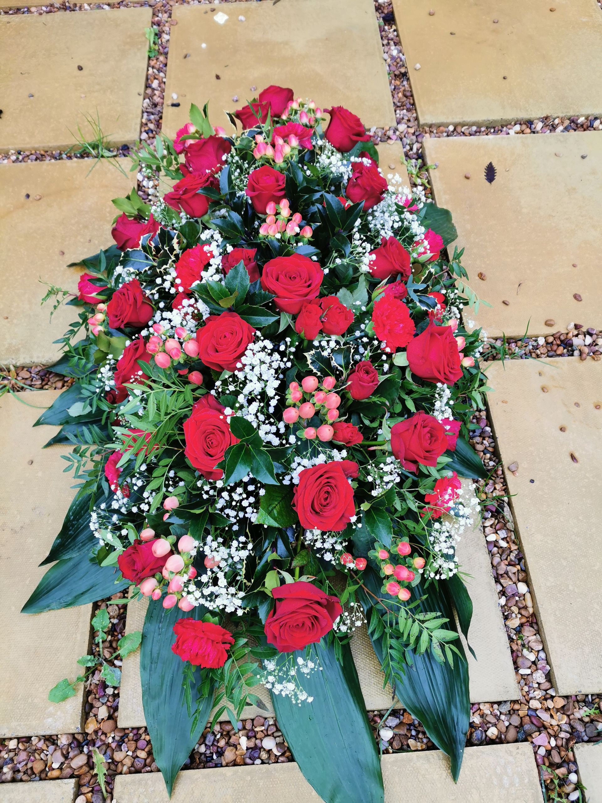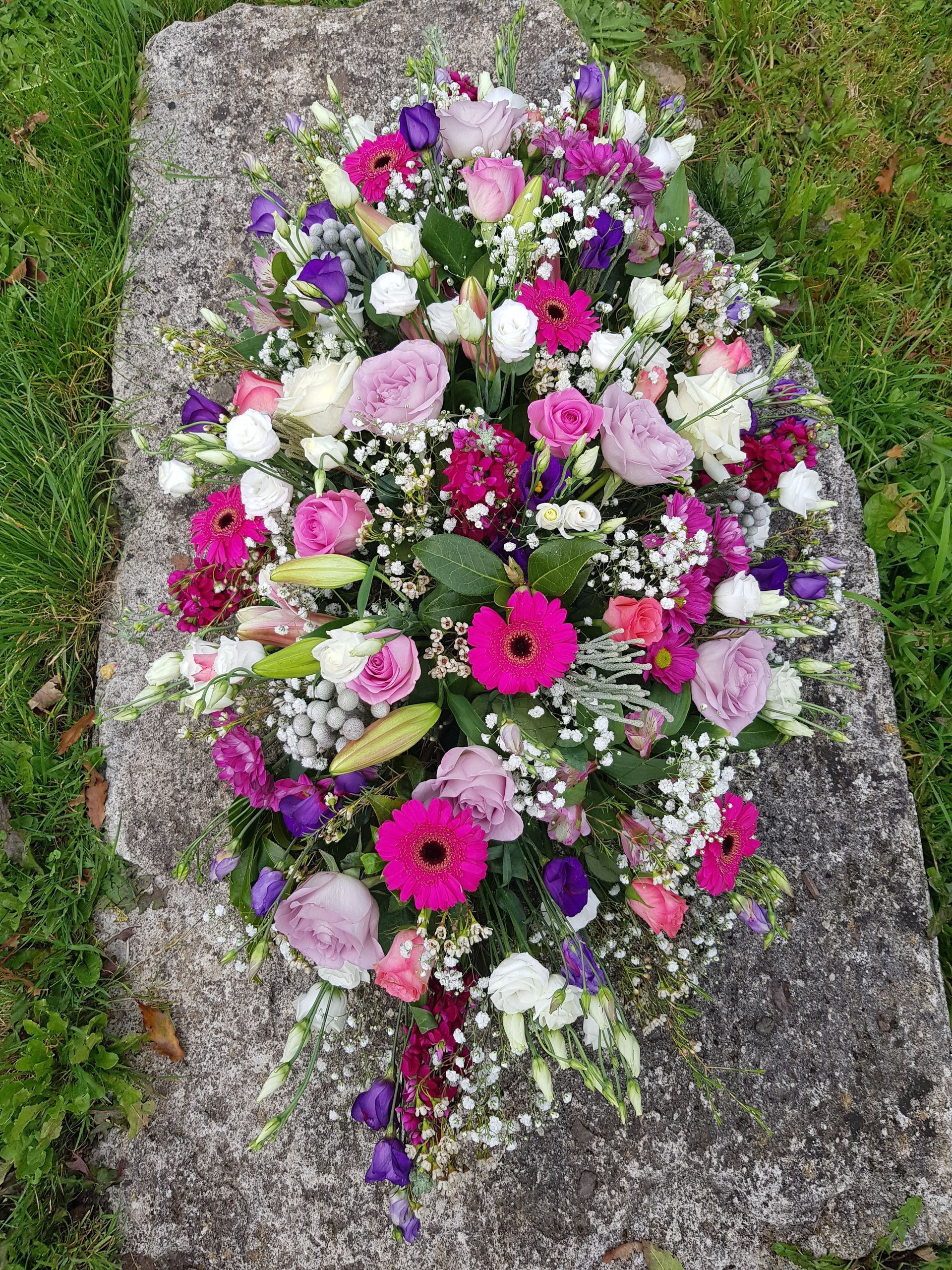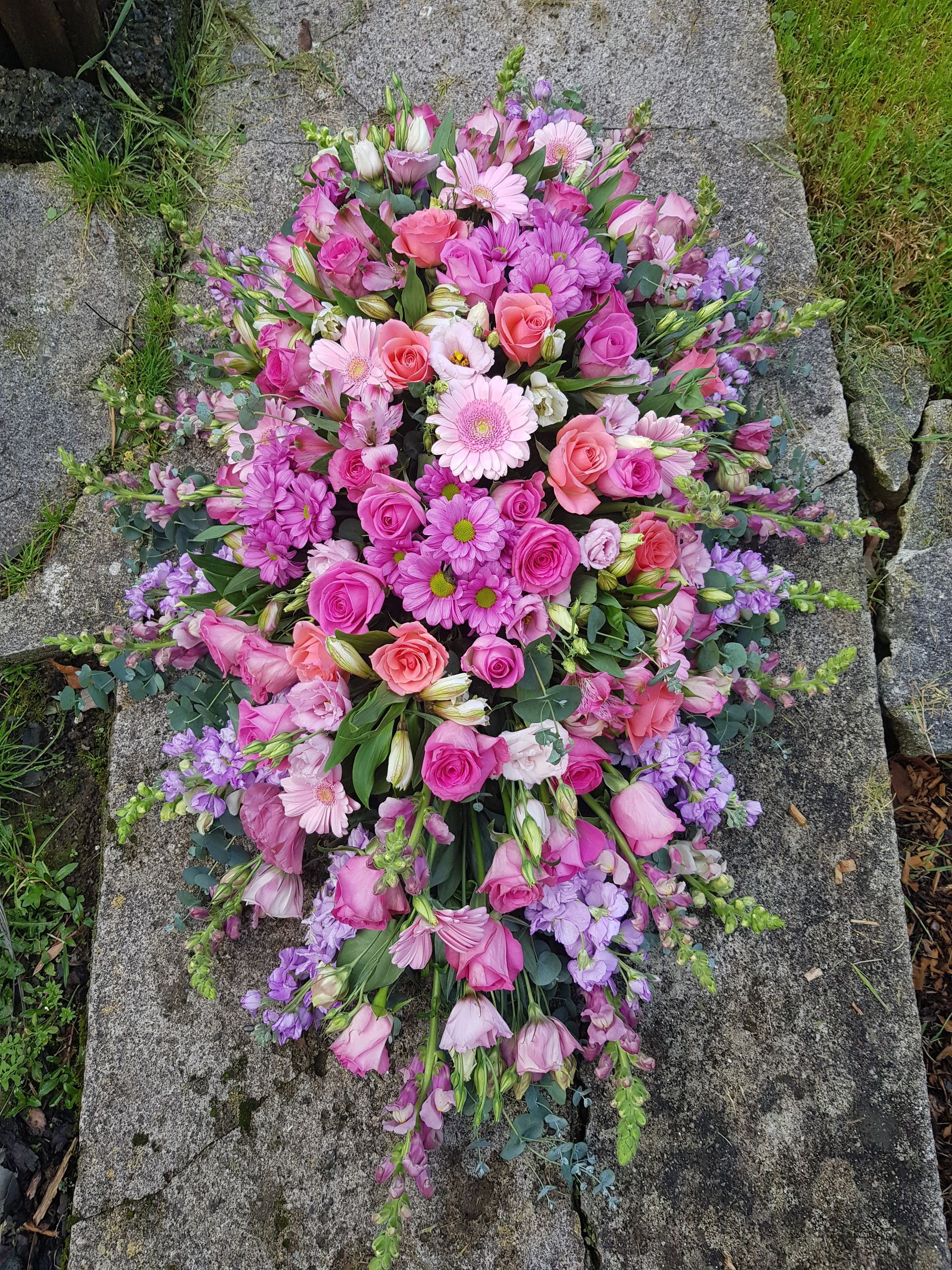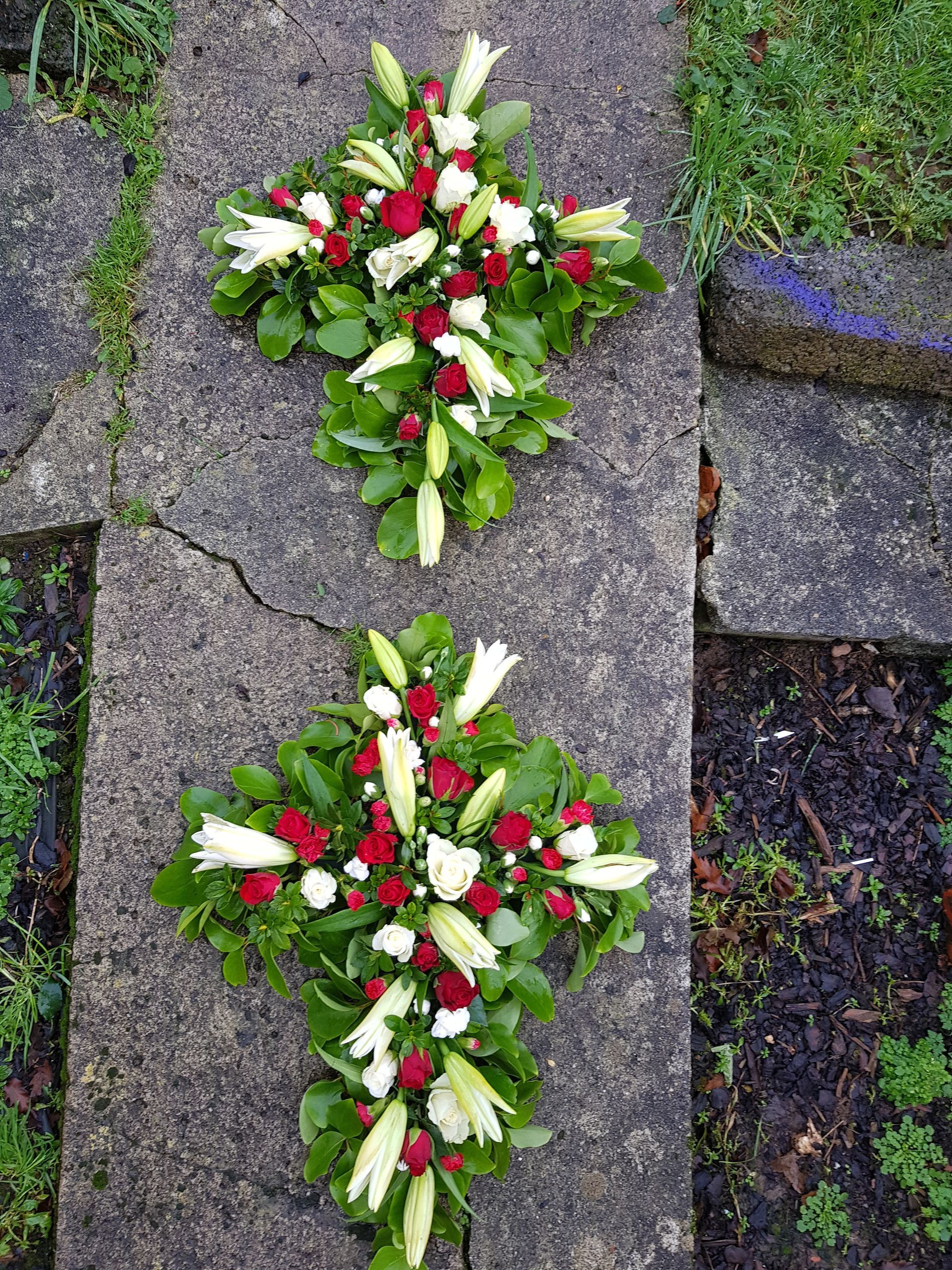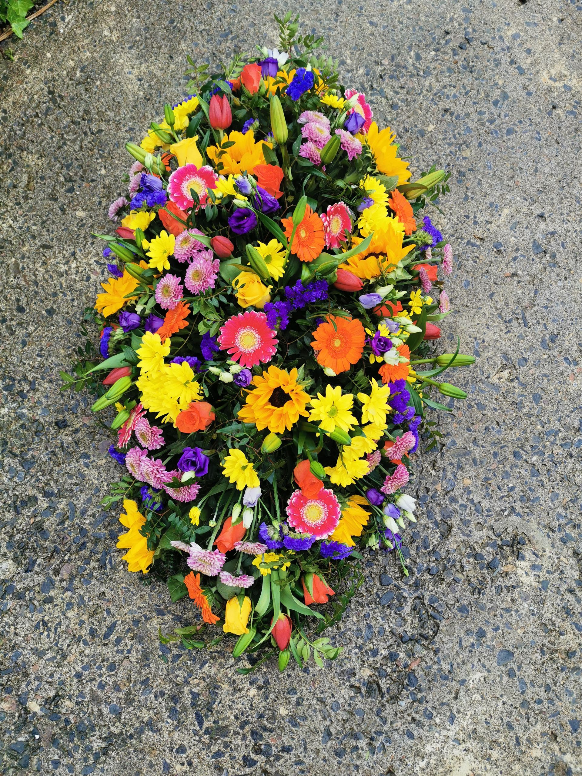 Circular posies in a dish from £25, Coffin sprays vary on flowers & sizes required. Gates to heaven £85