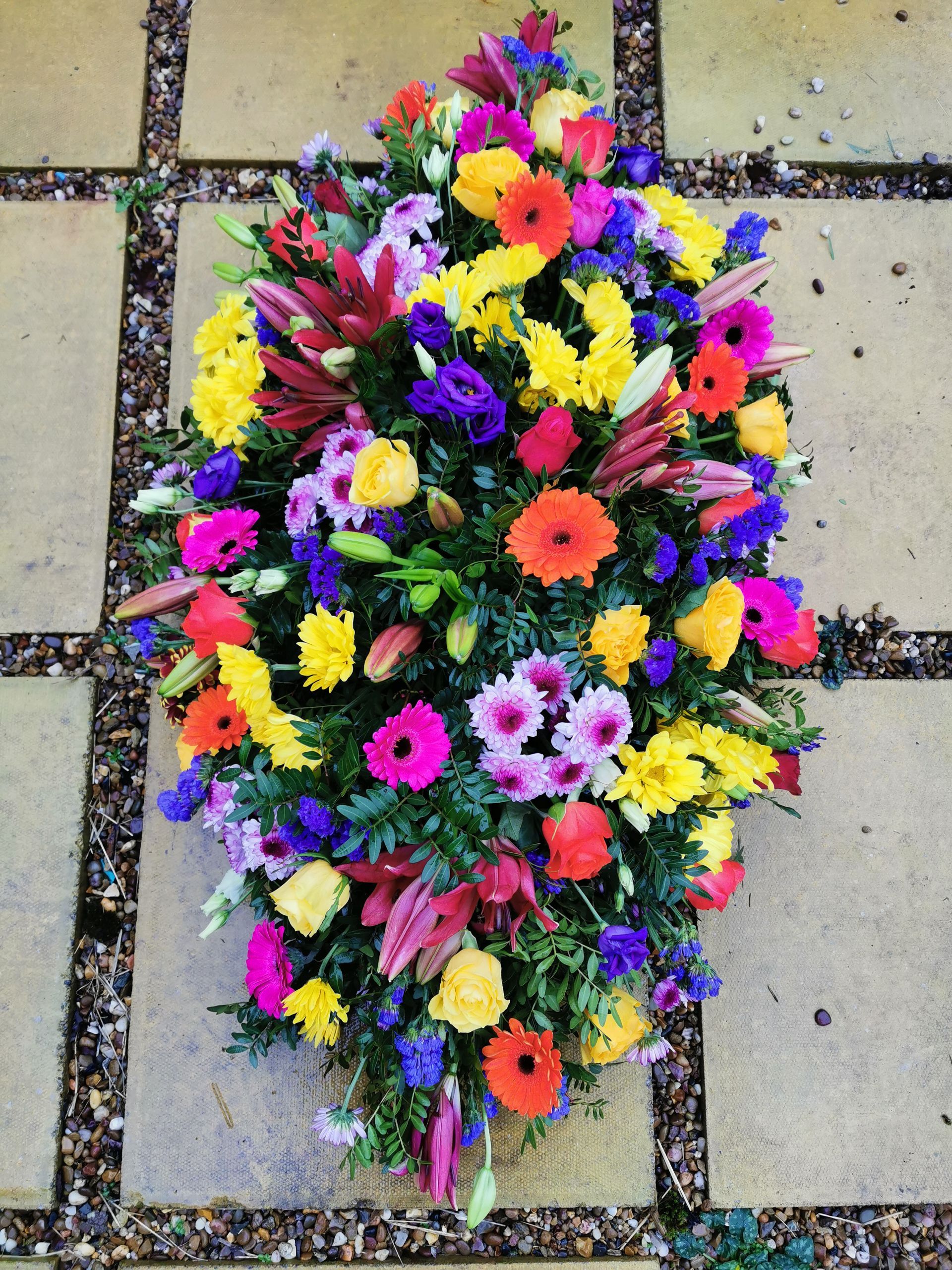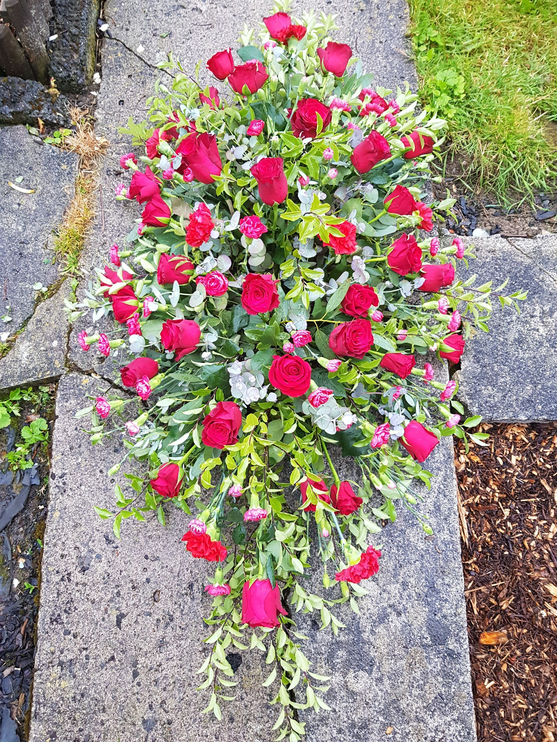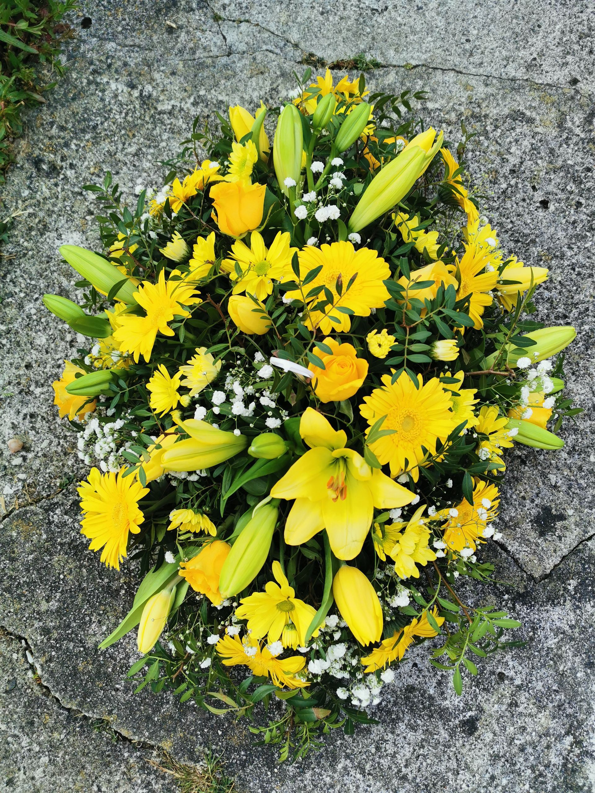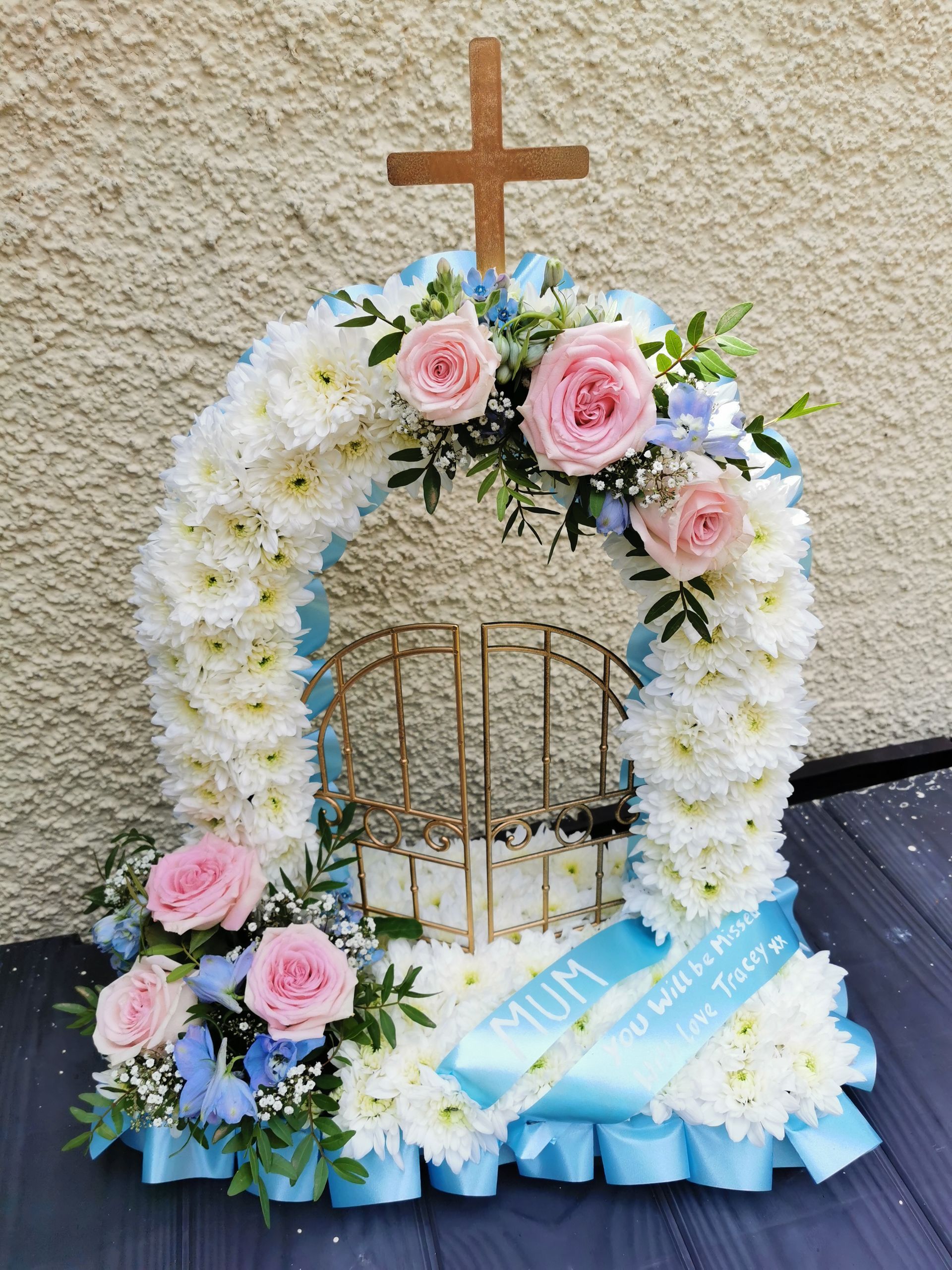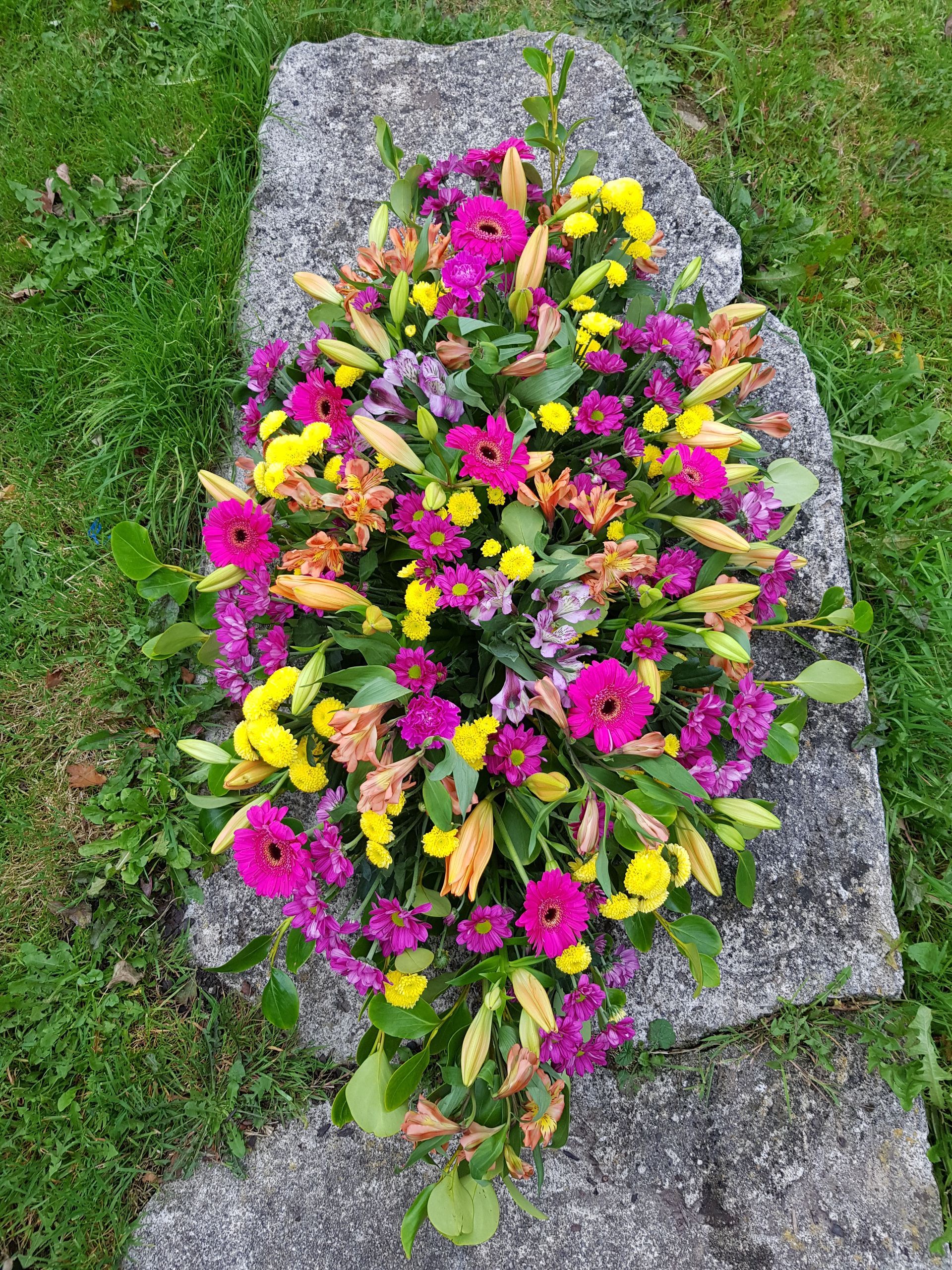 Circular posies in a dish from £25, Coffin sprays vary on flowers & sizes required. Gates to heaven £85