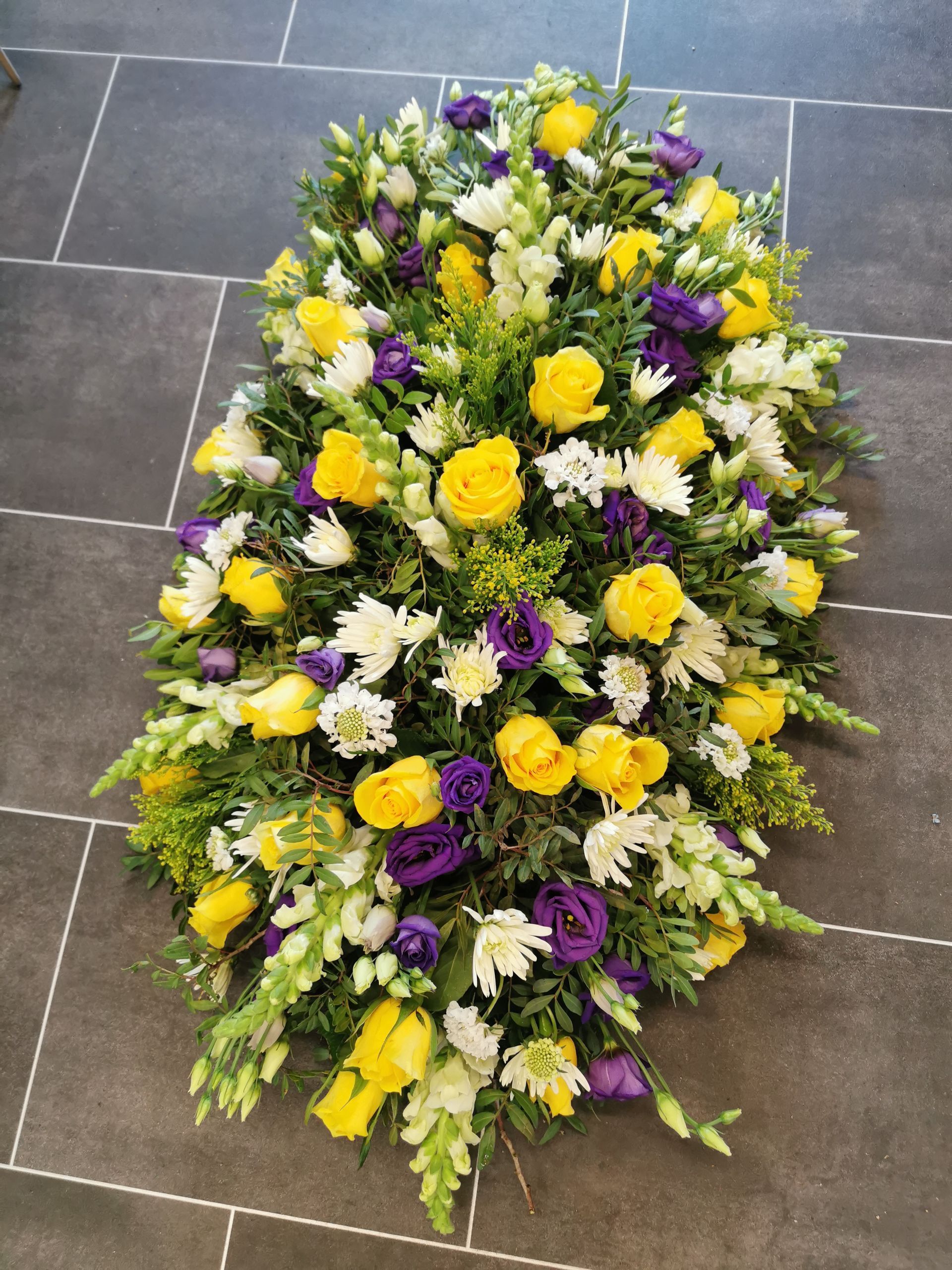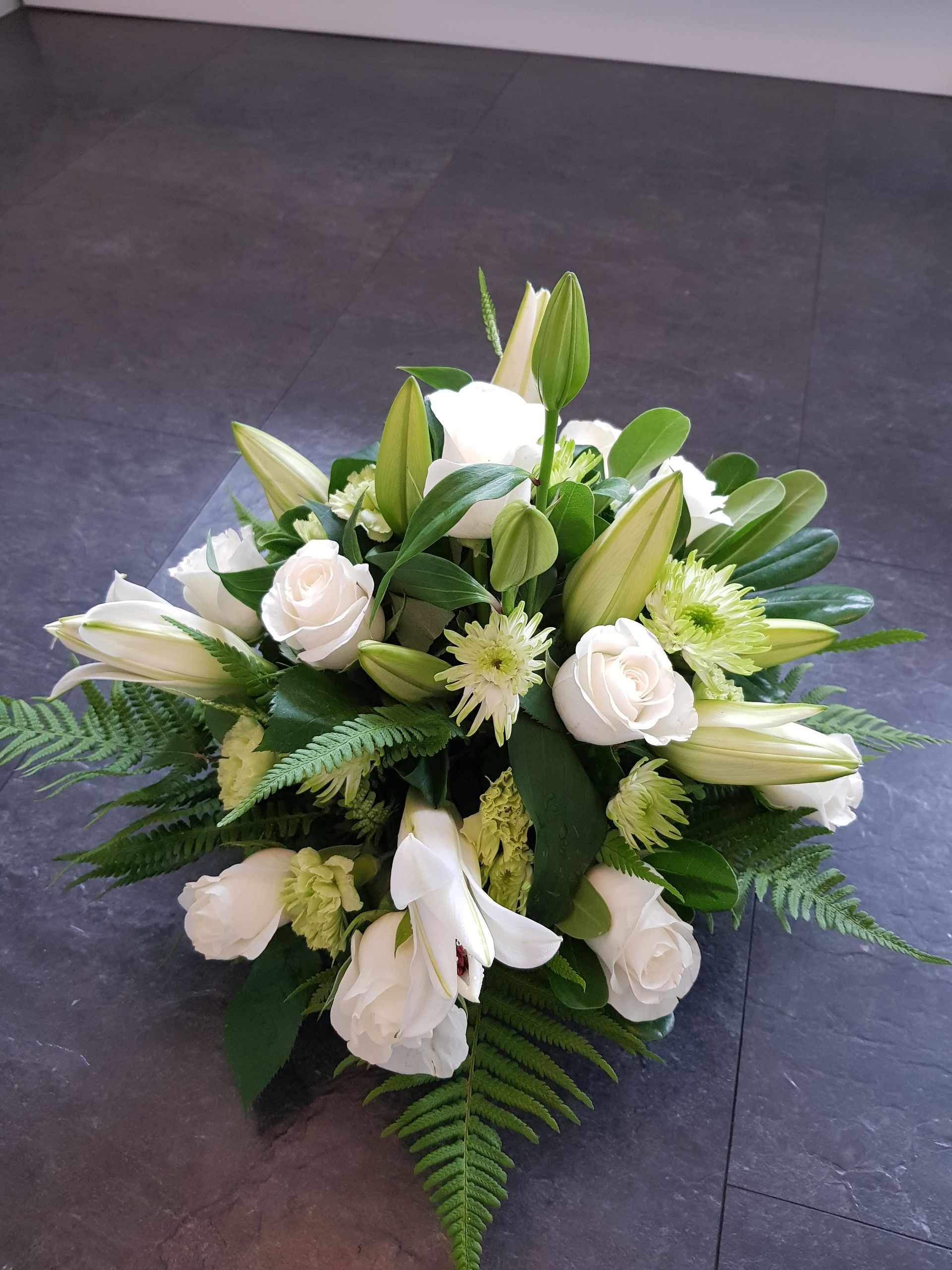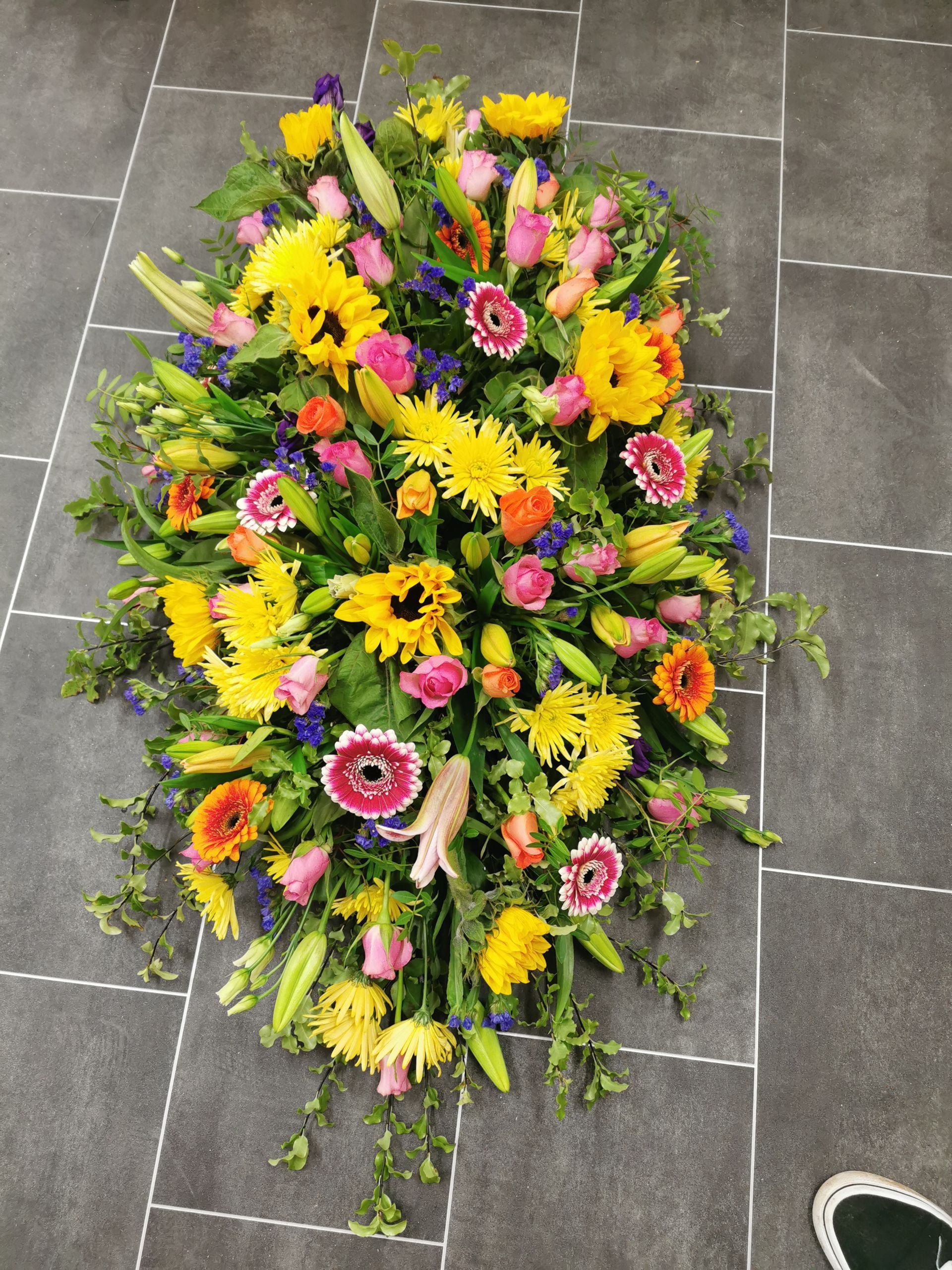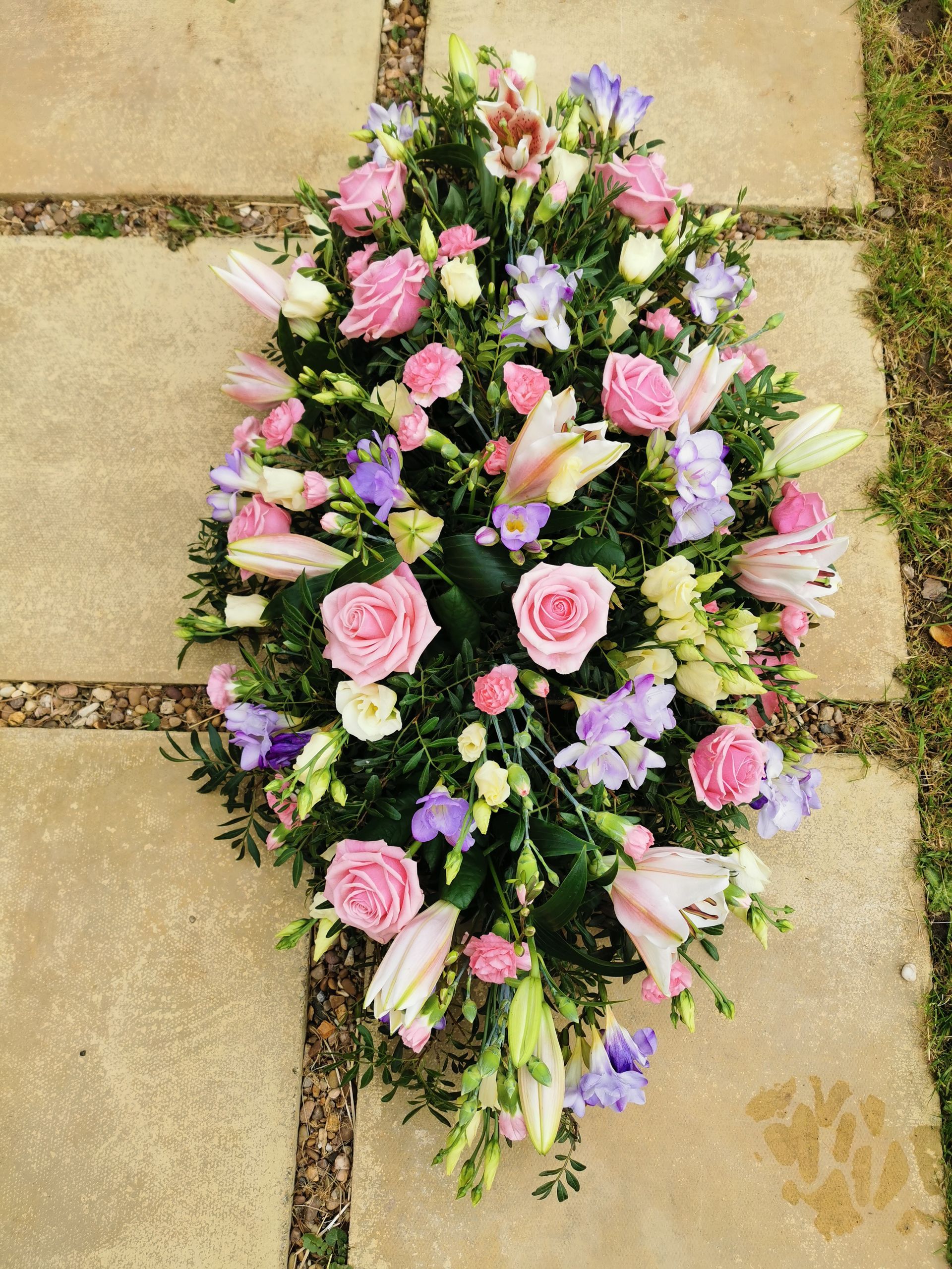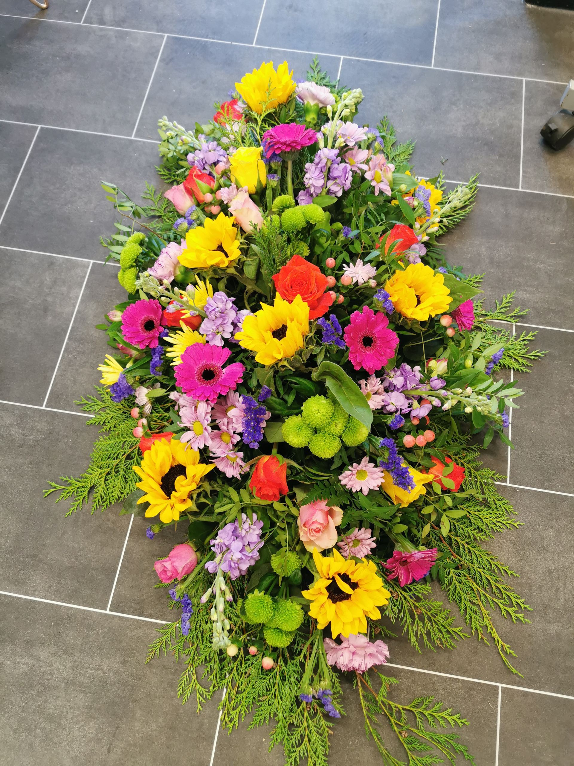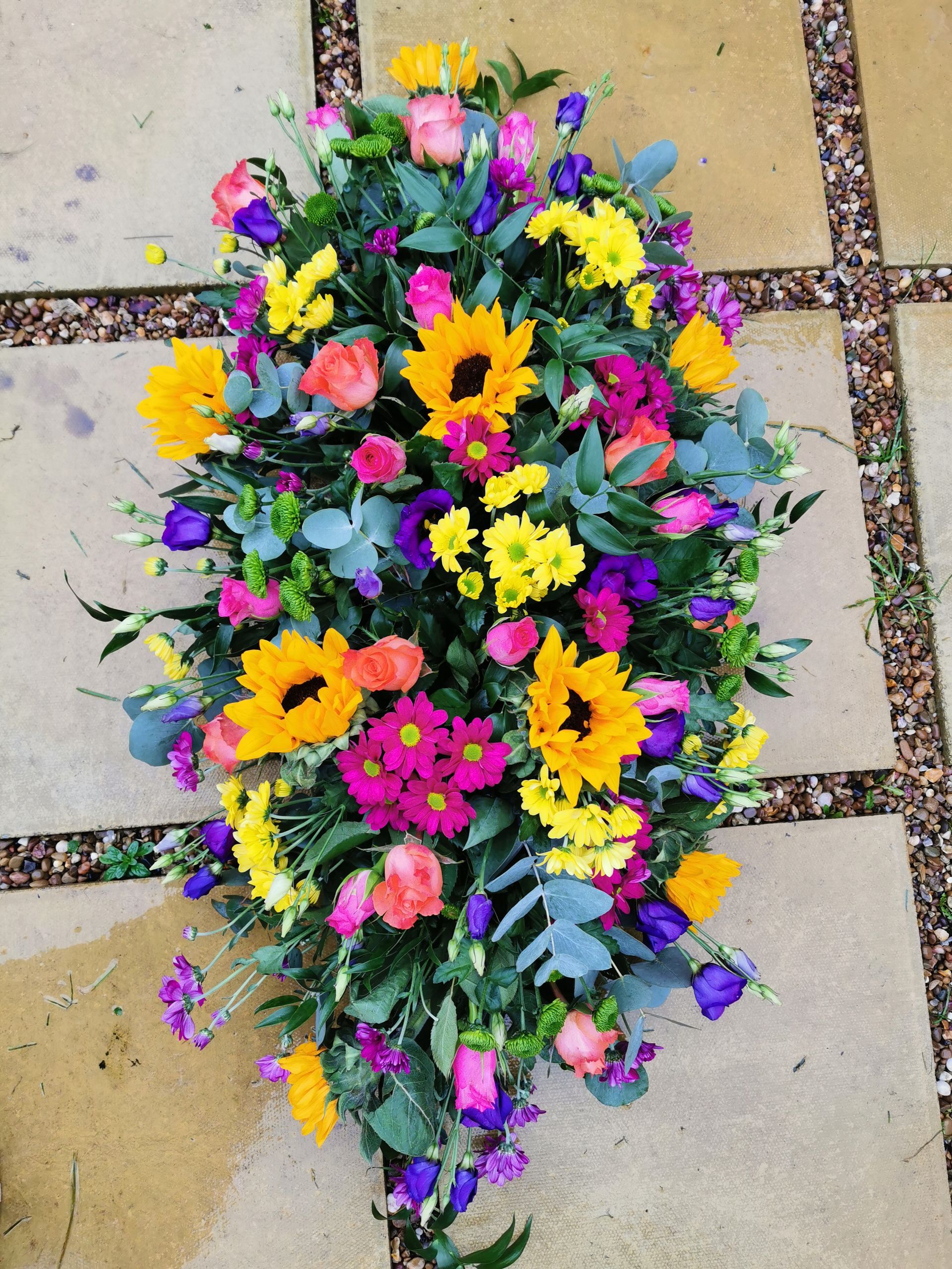 Circular posies in a dish from £25, Coffin sprays vary on flowers & sizes required. Gates to heaven £85