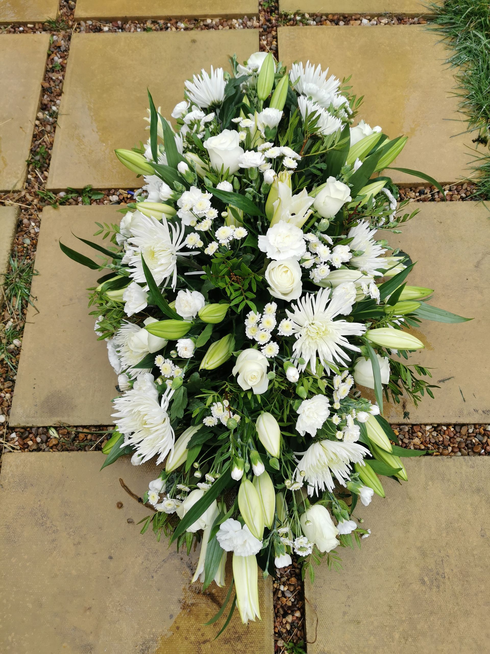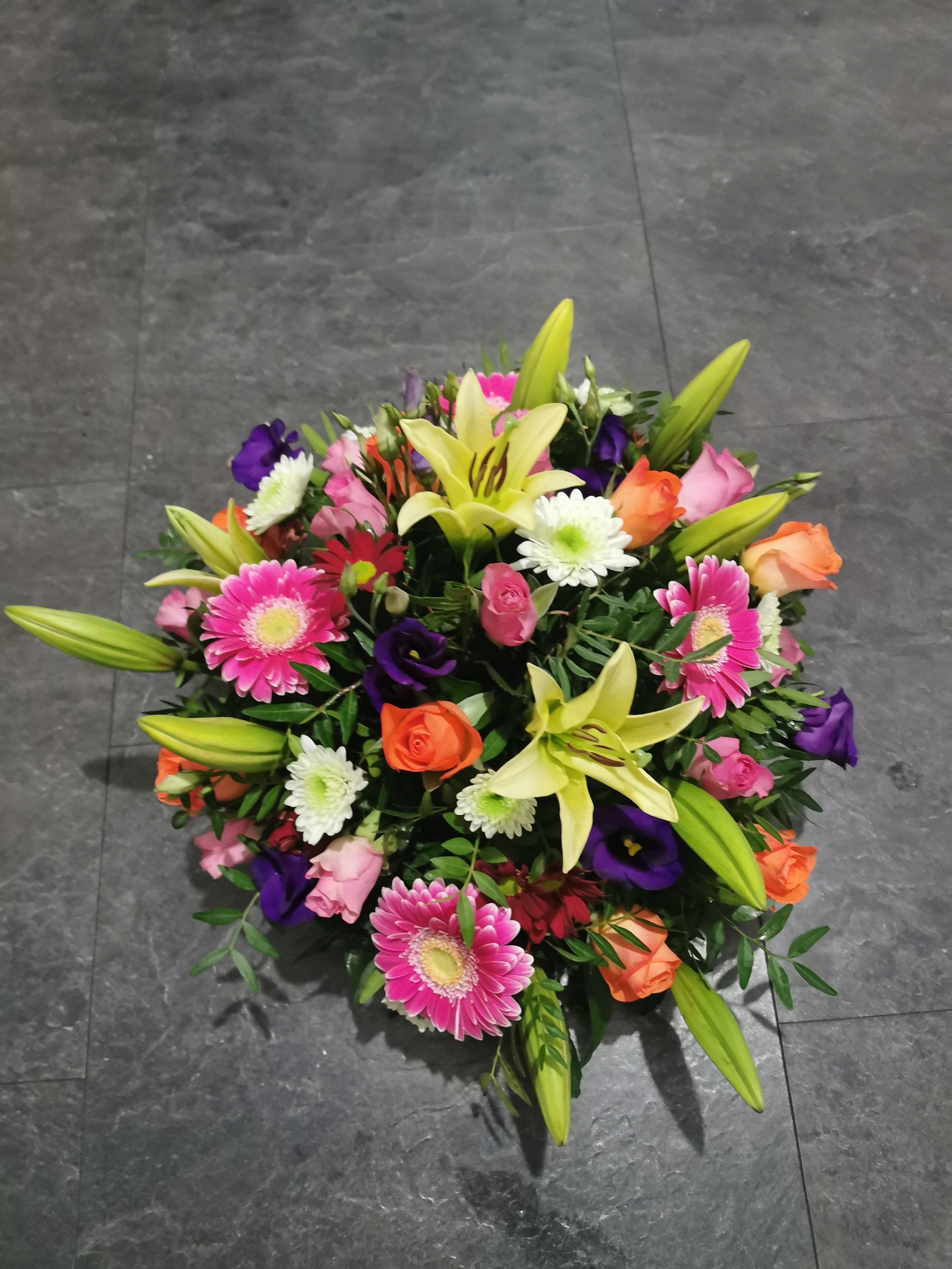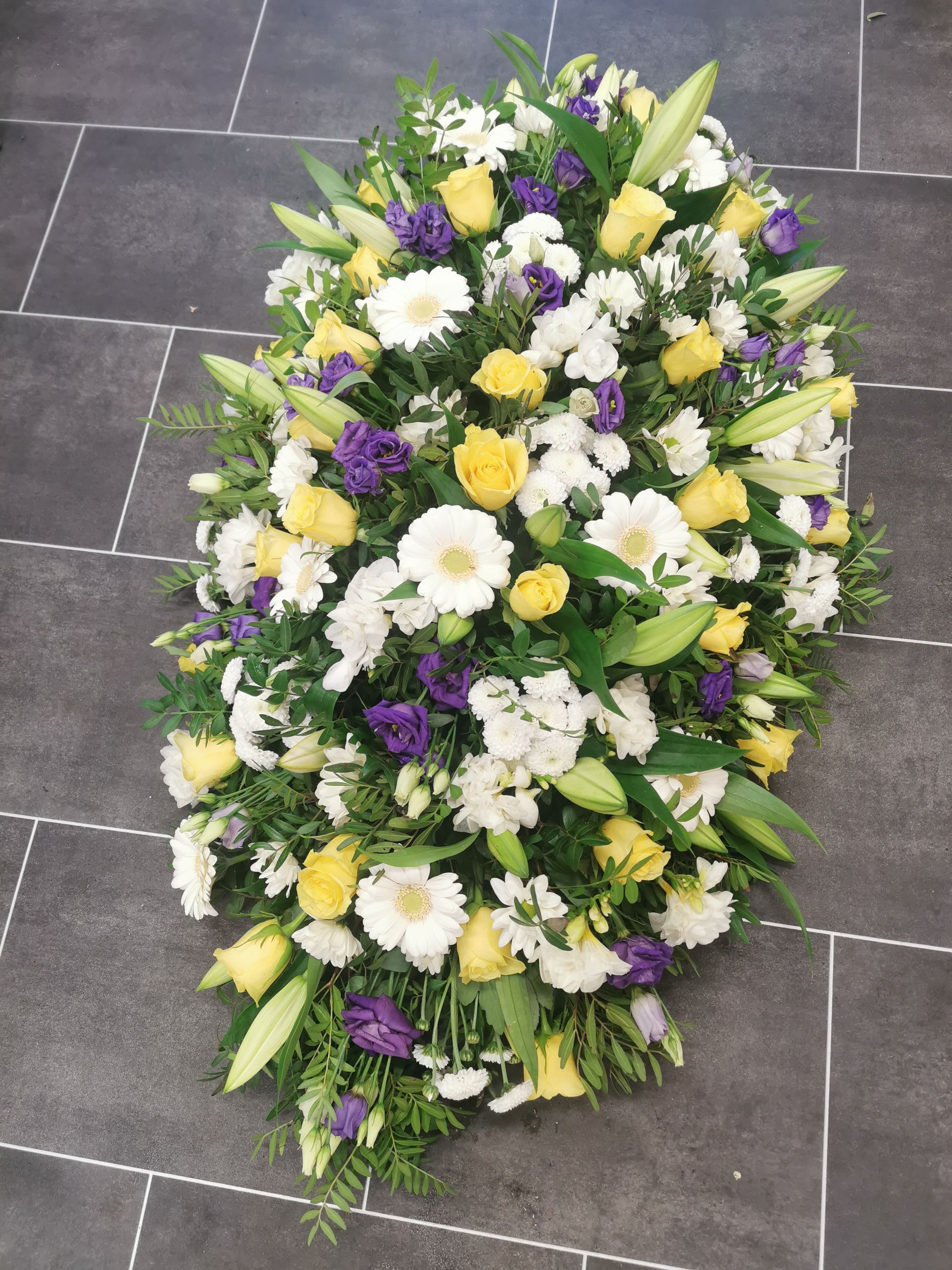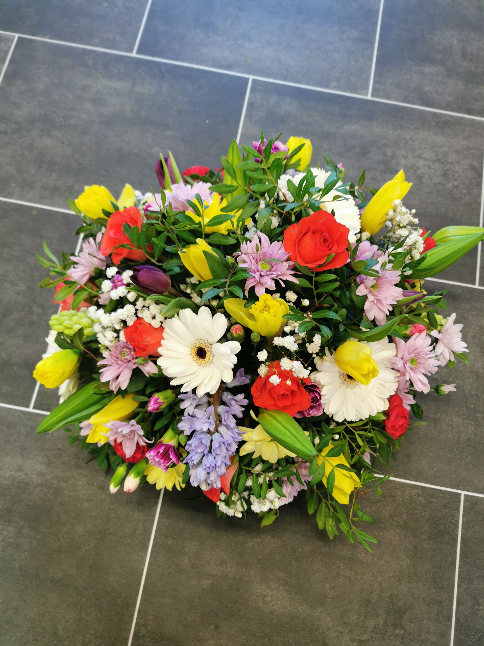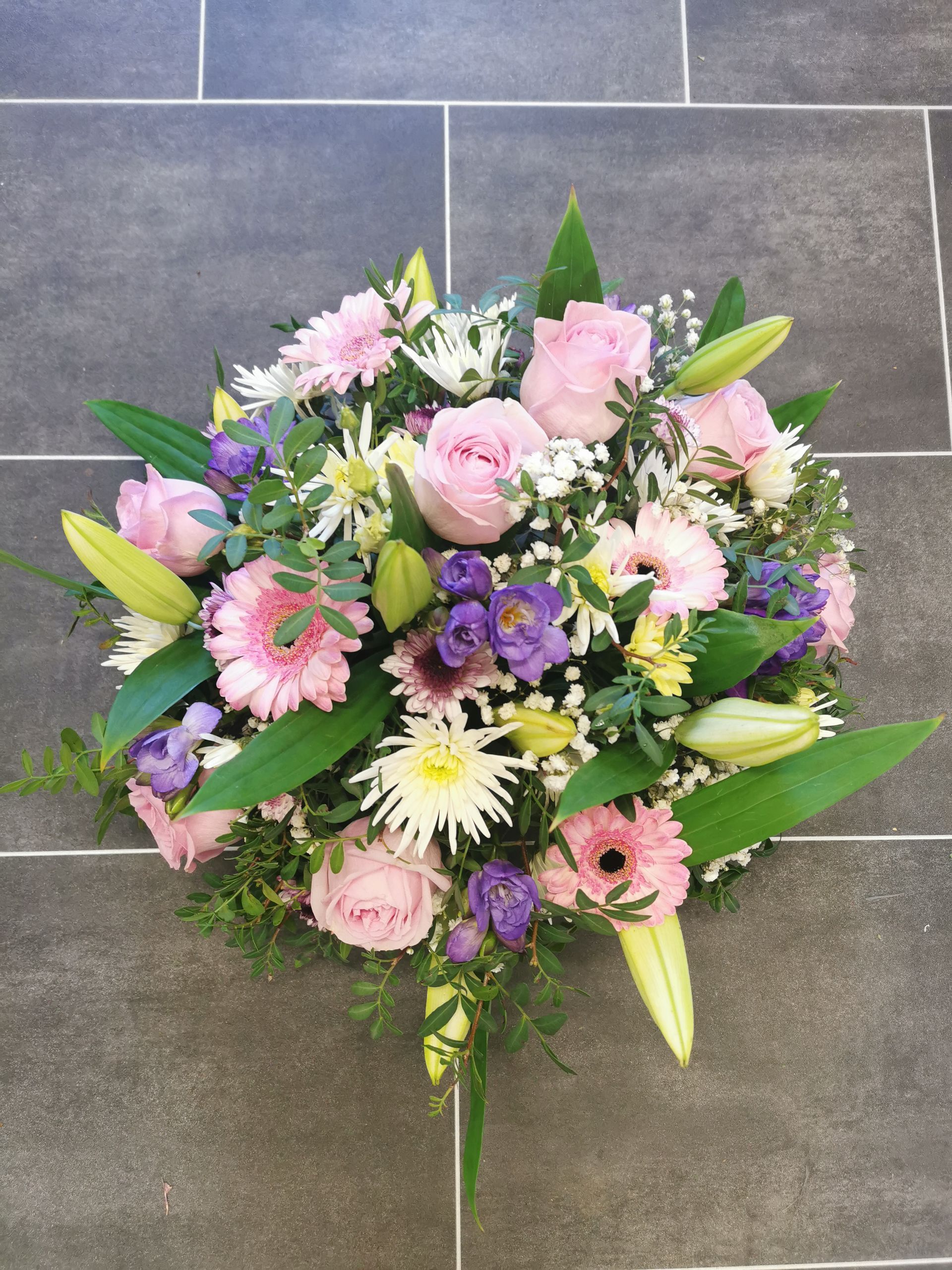 Circular posies in a dish from £25, Coffin sprays vary on flowers & sizes required. Gates to heaven £85