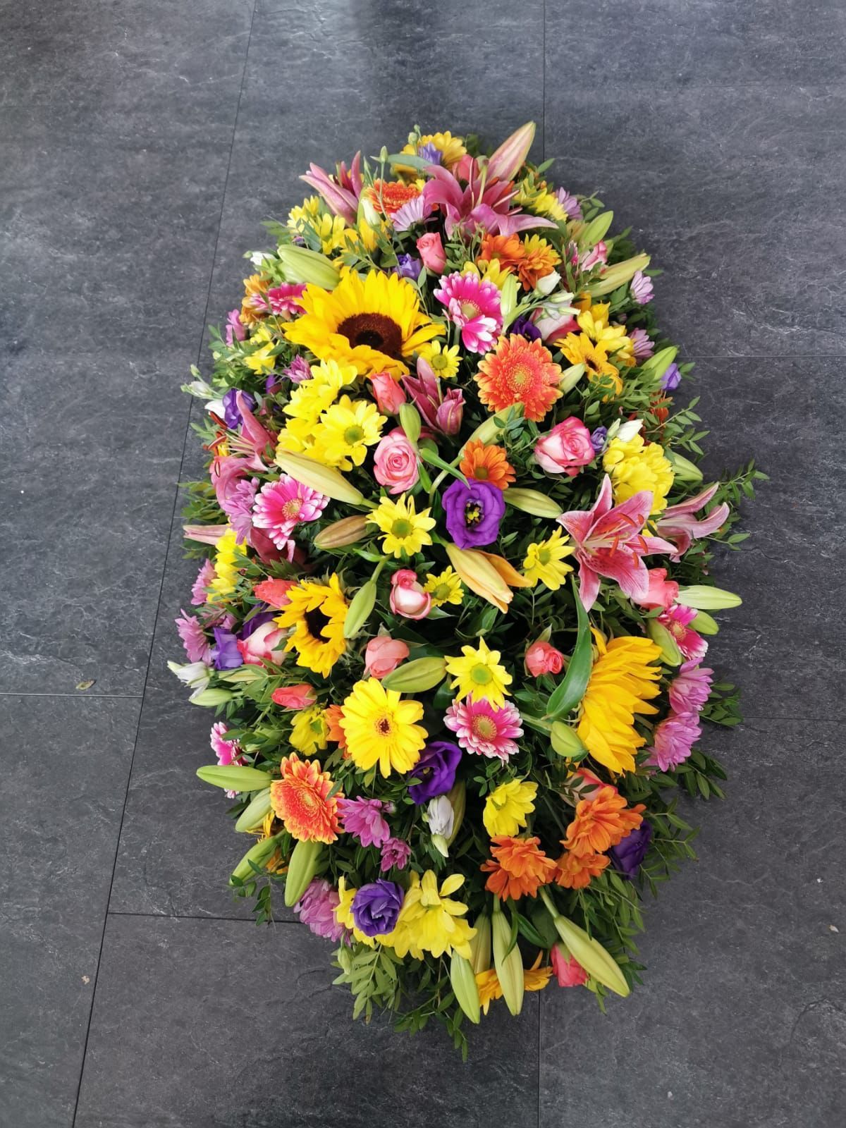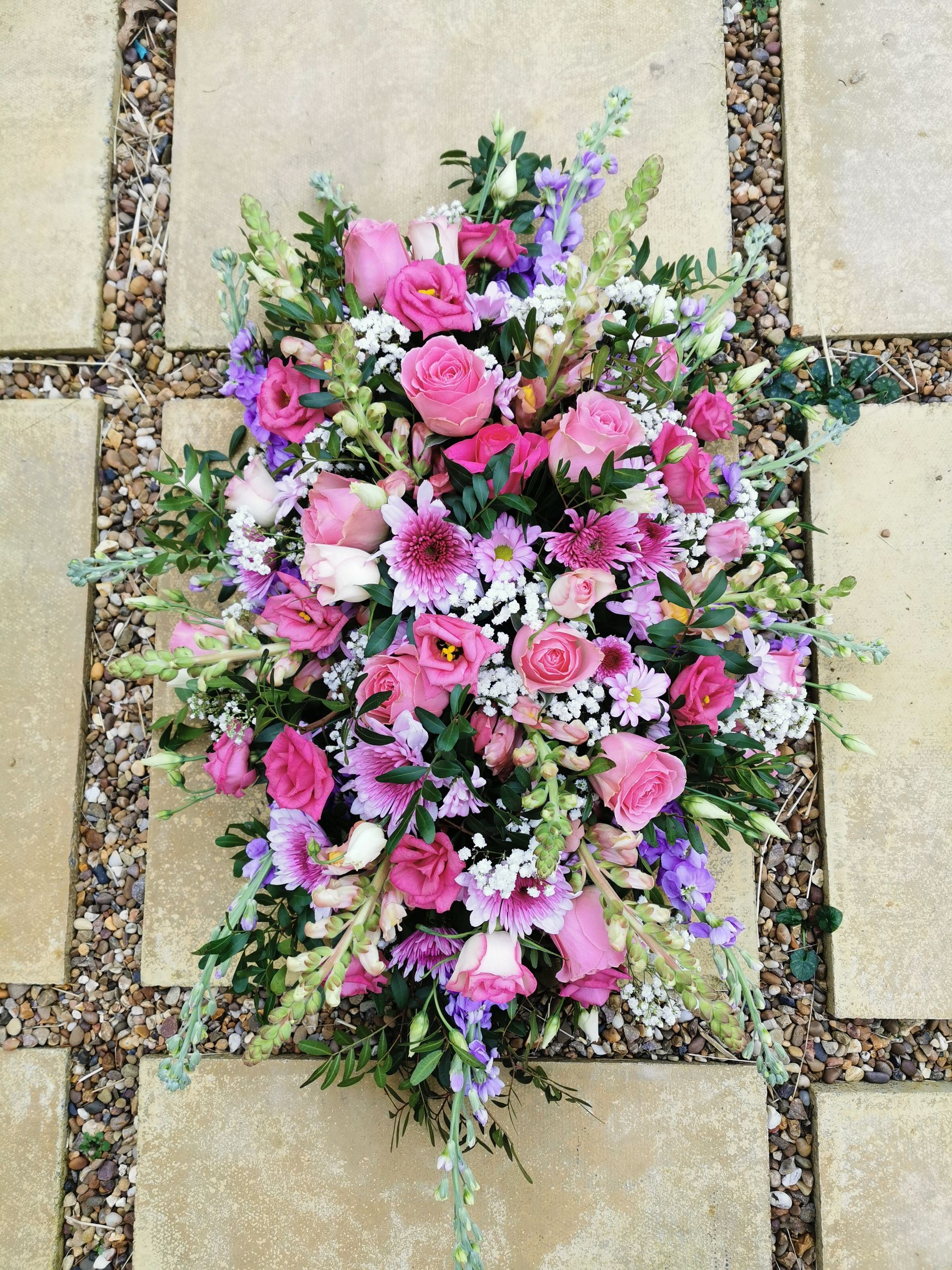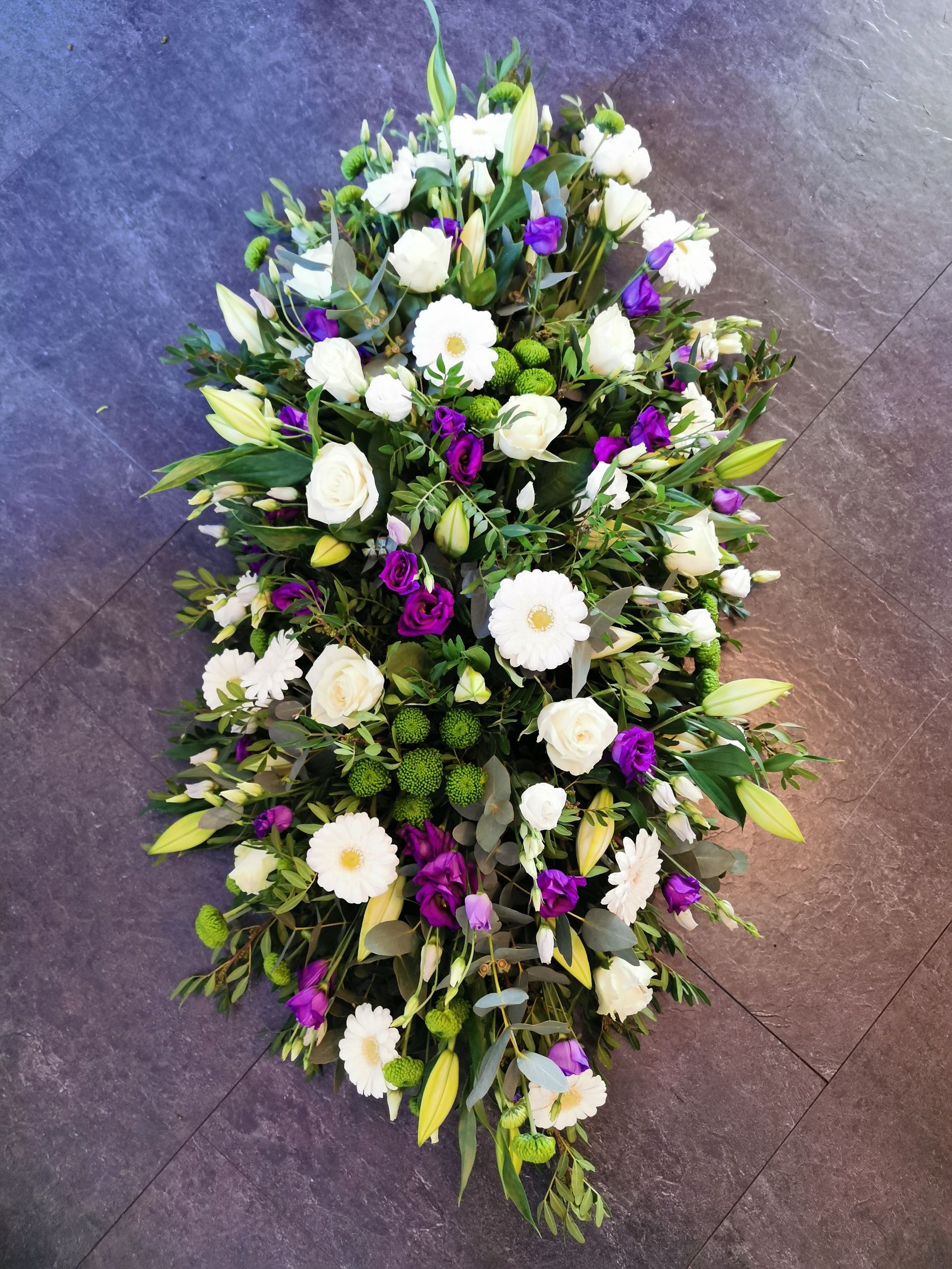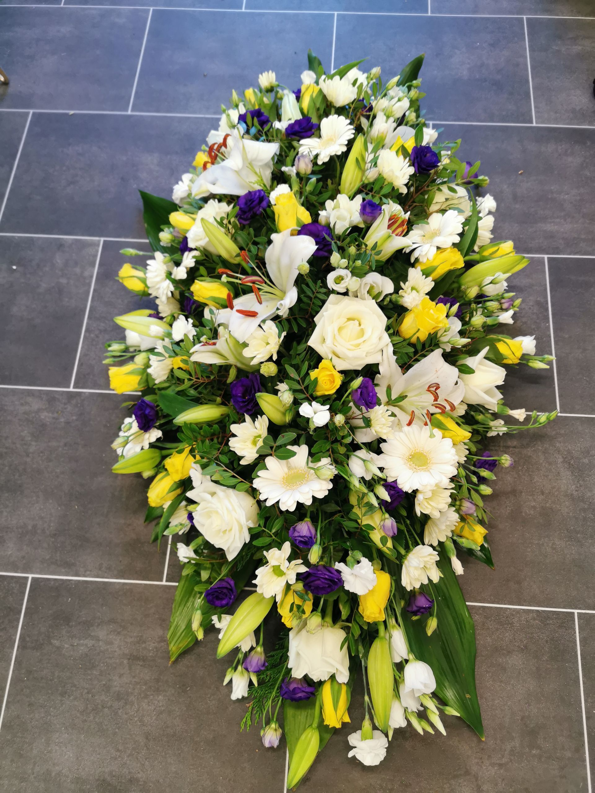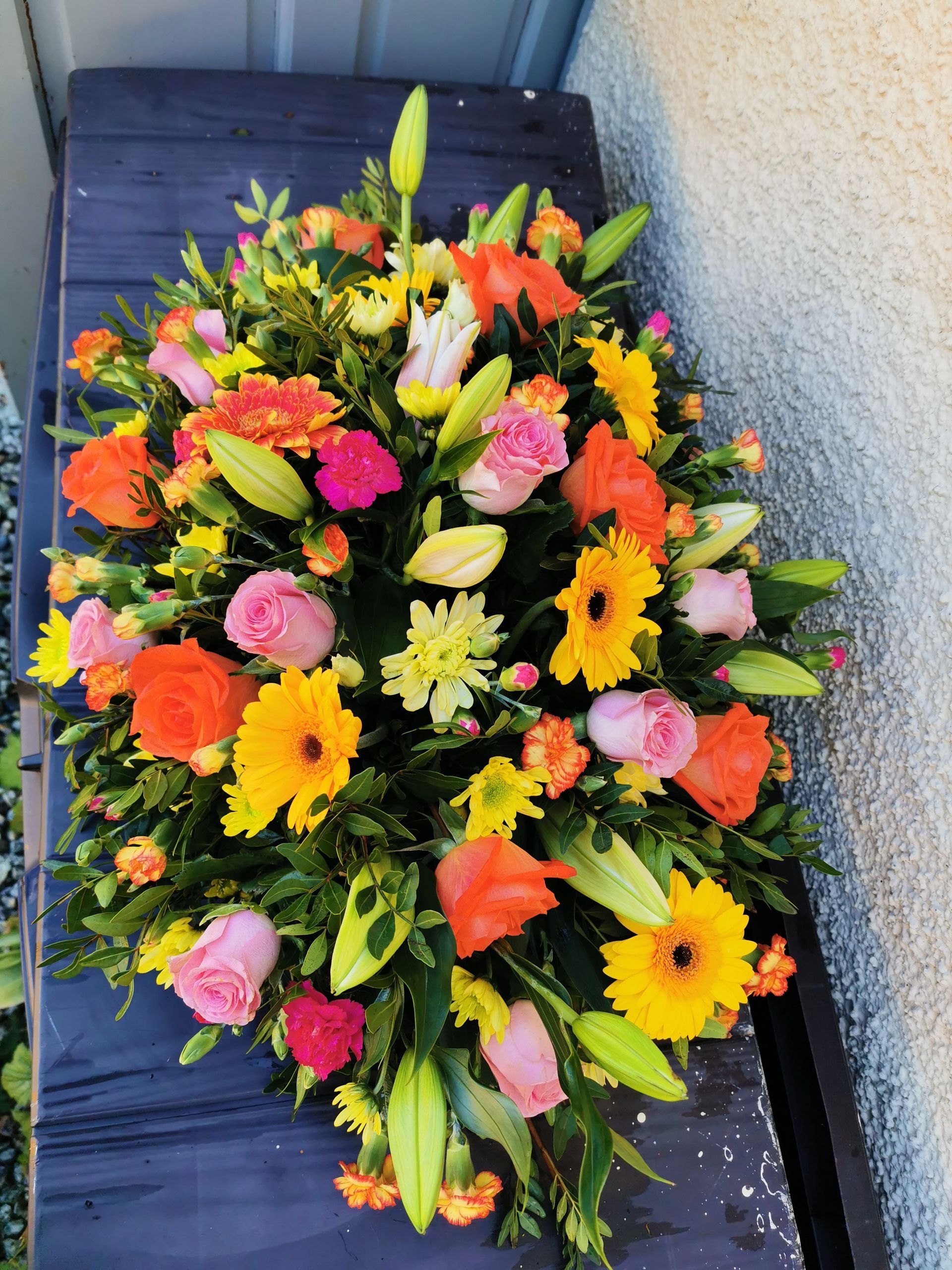 Circular posies in a dish from £25, Coffin sprays vary on flowers & sizes required. Gates to heaven £85