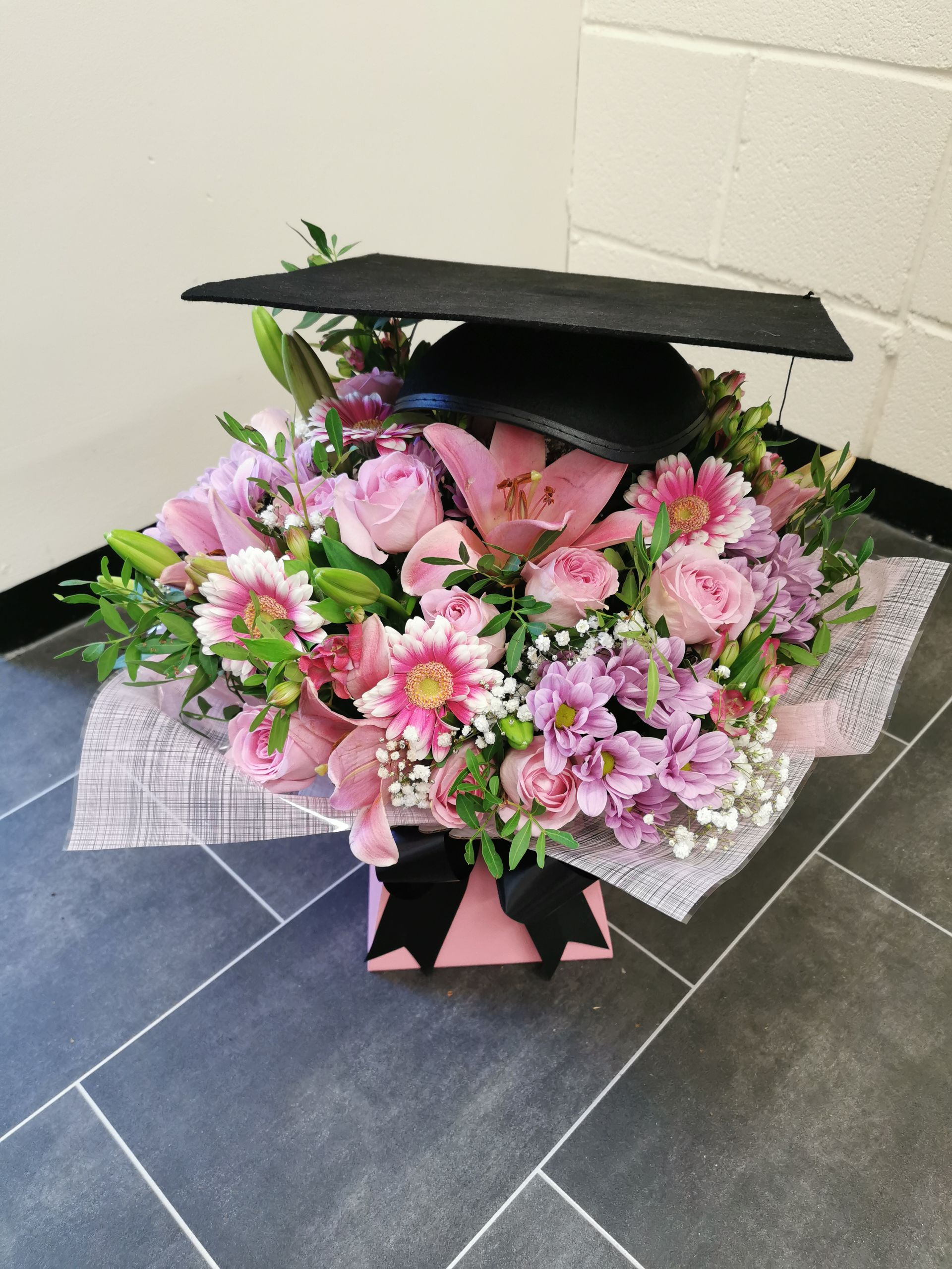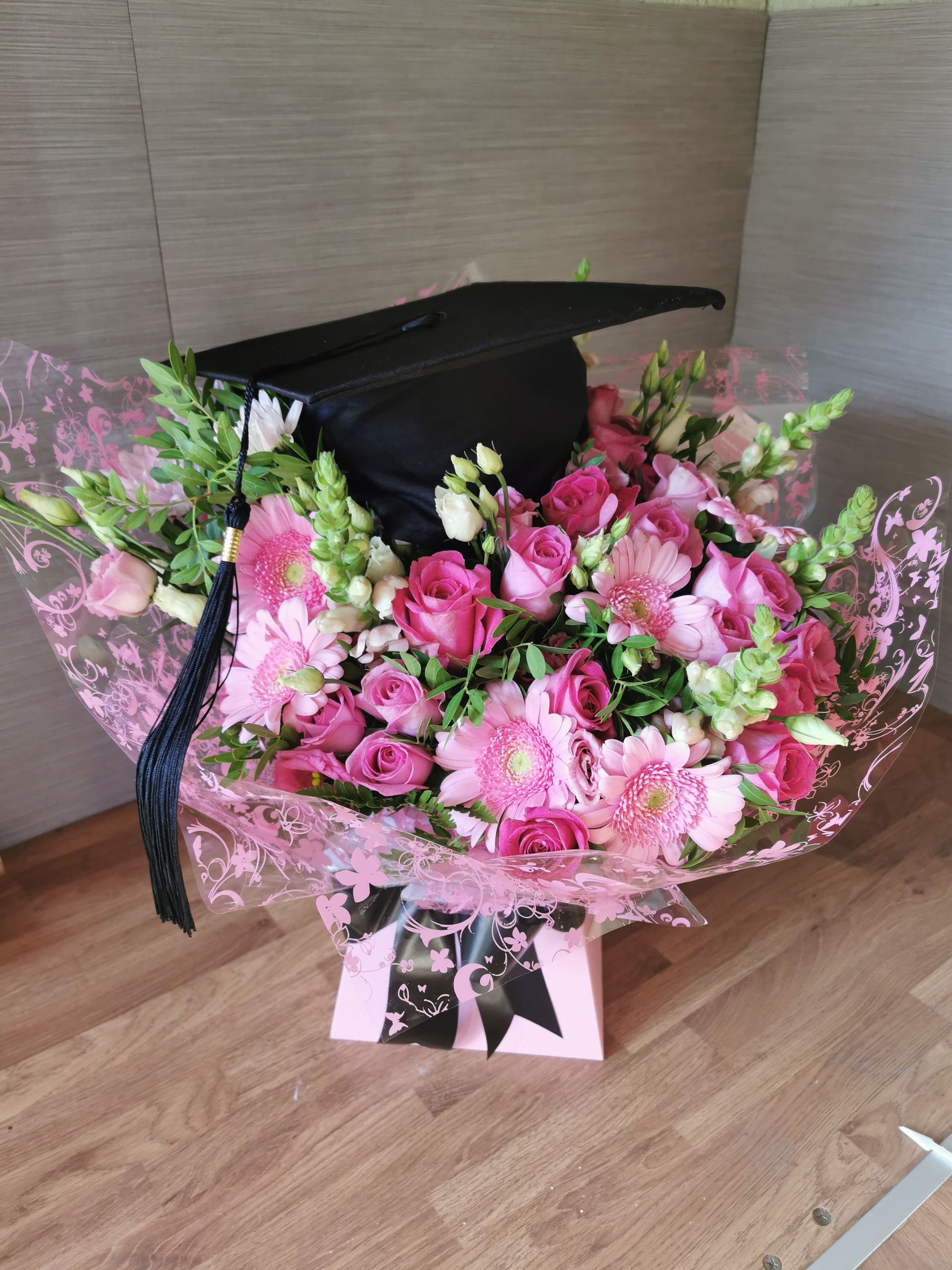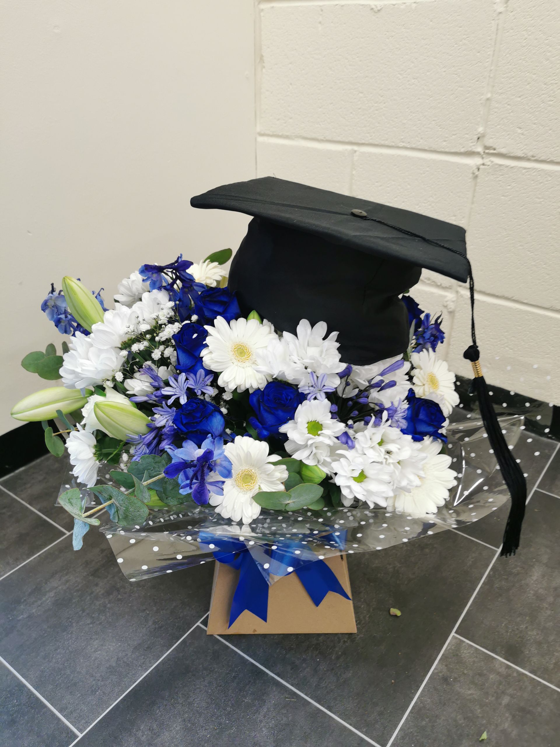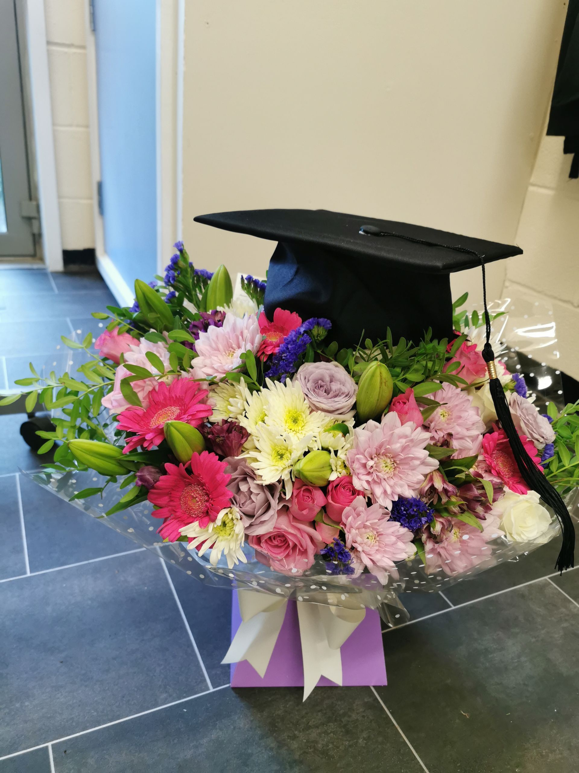 or a very unique bouquet with its very own graduation cap, free chocolates & delivery included within Plymouth & some surrounding areas, all for only £45! (Made to your colour preference.)